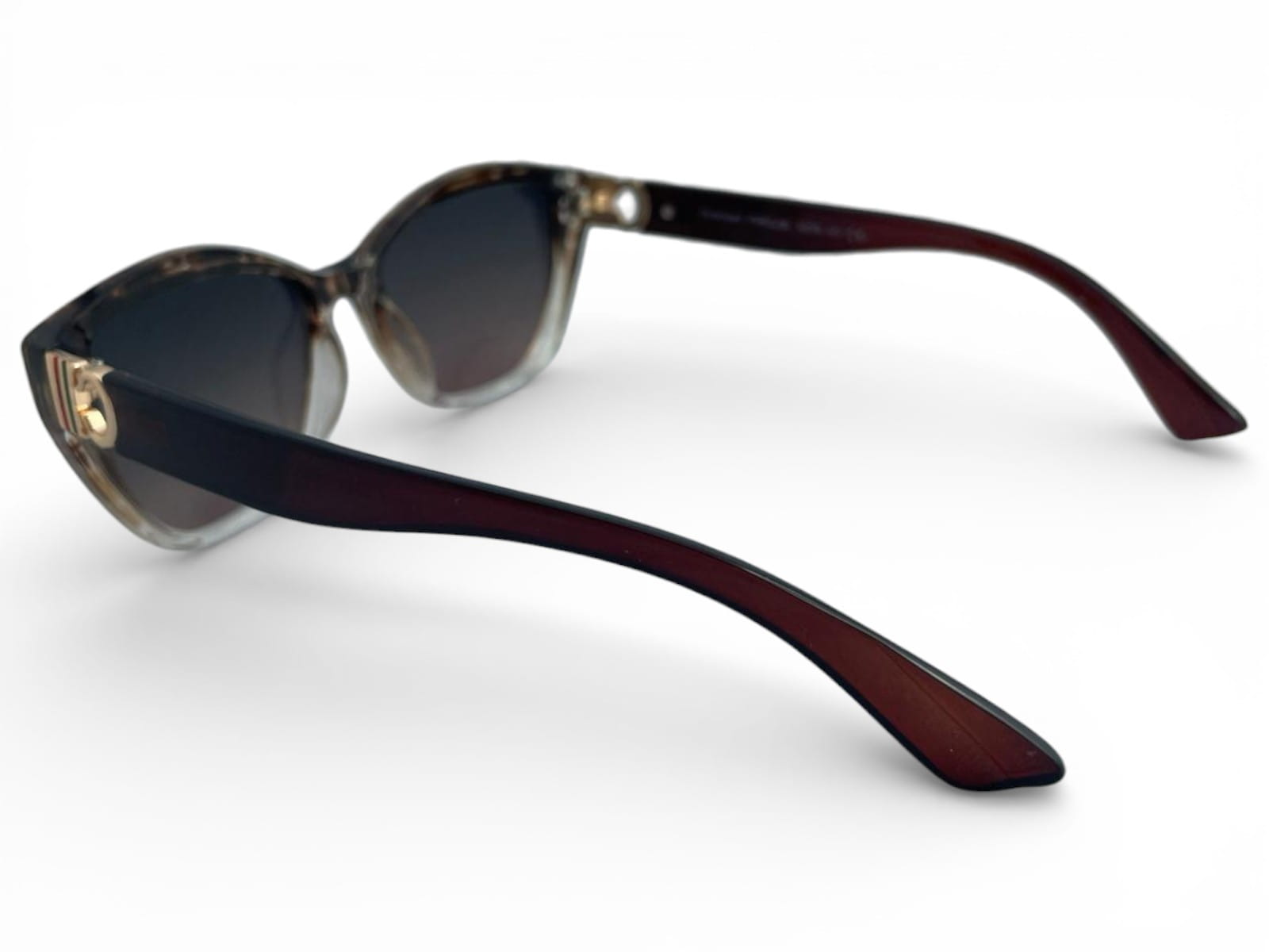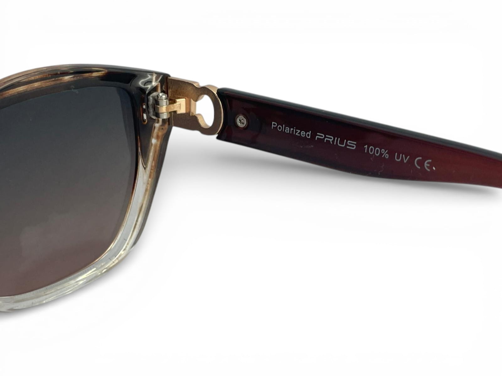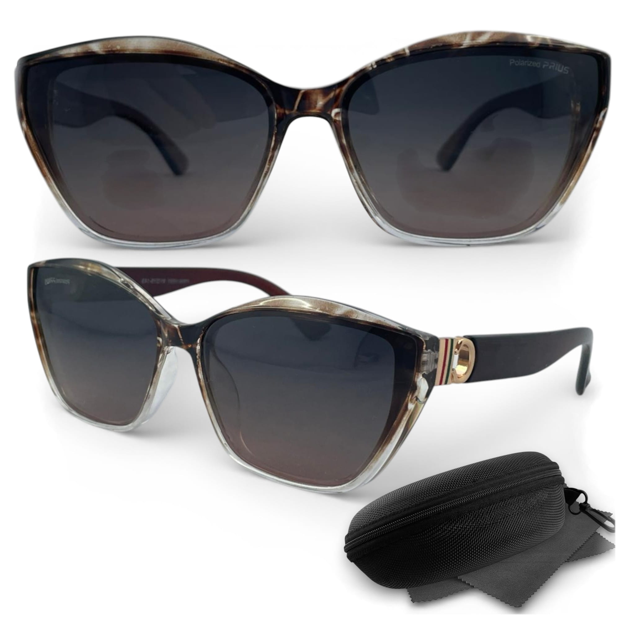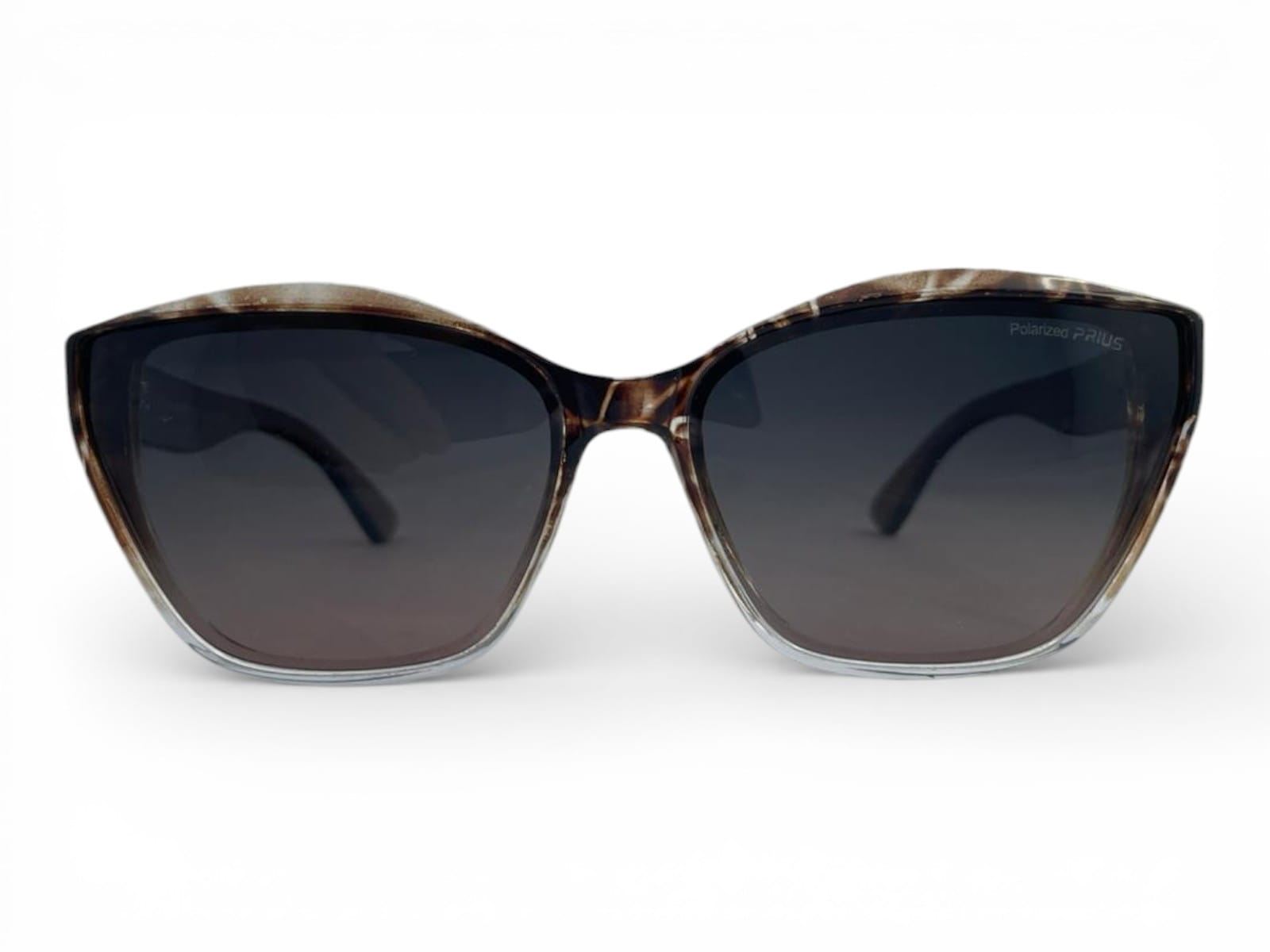 Damskie okulary przeciwsłoneczne PRIUS PRW-551 C4 z oprawką w melanżu odcieni brązu i czarnymi zausznikami. Styl cat eye, soczewki z delikatnym gradientem, polaryzacja i filtr UV400 – funkcjonalność i elegancja w jednym.