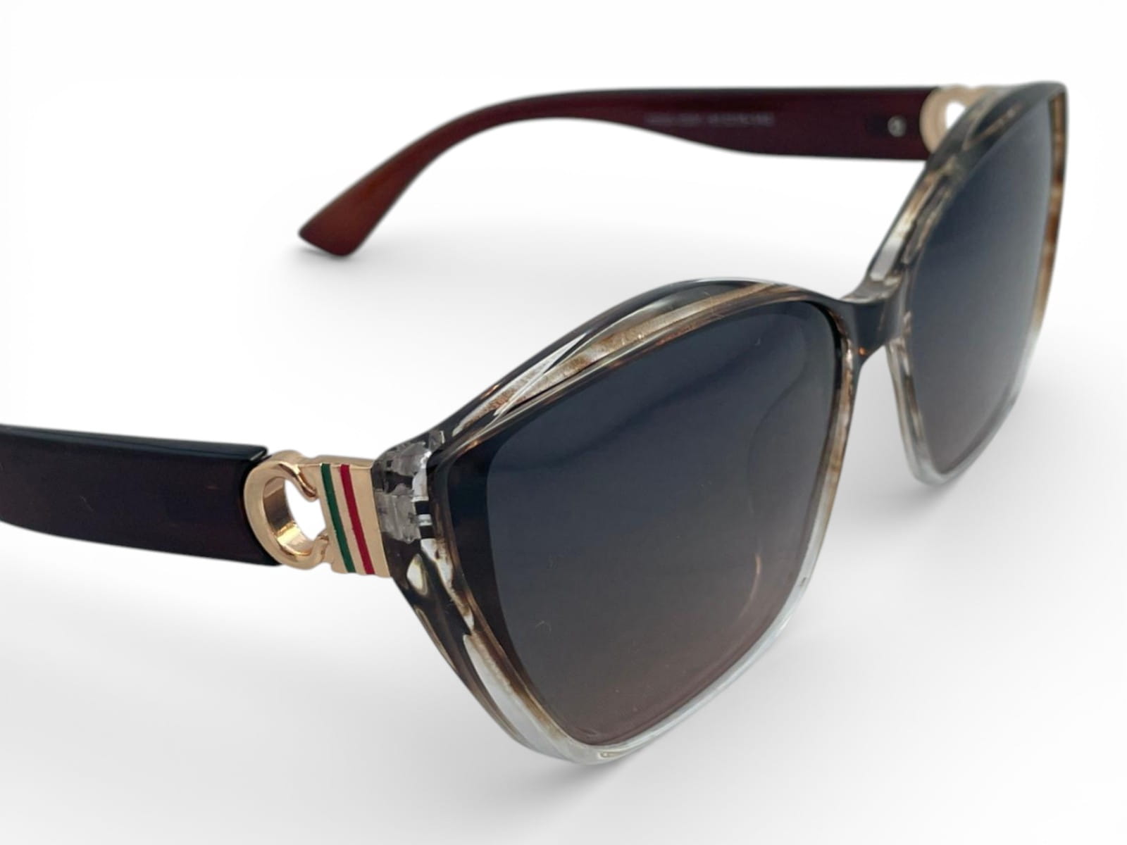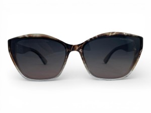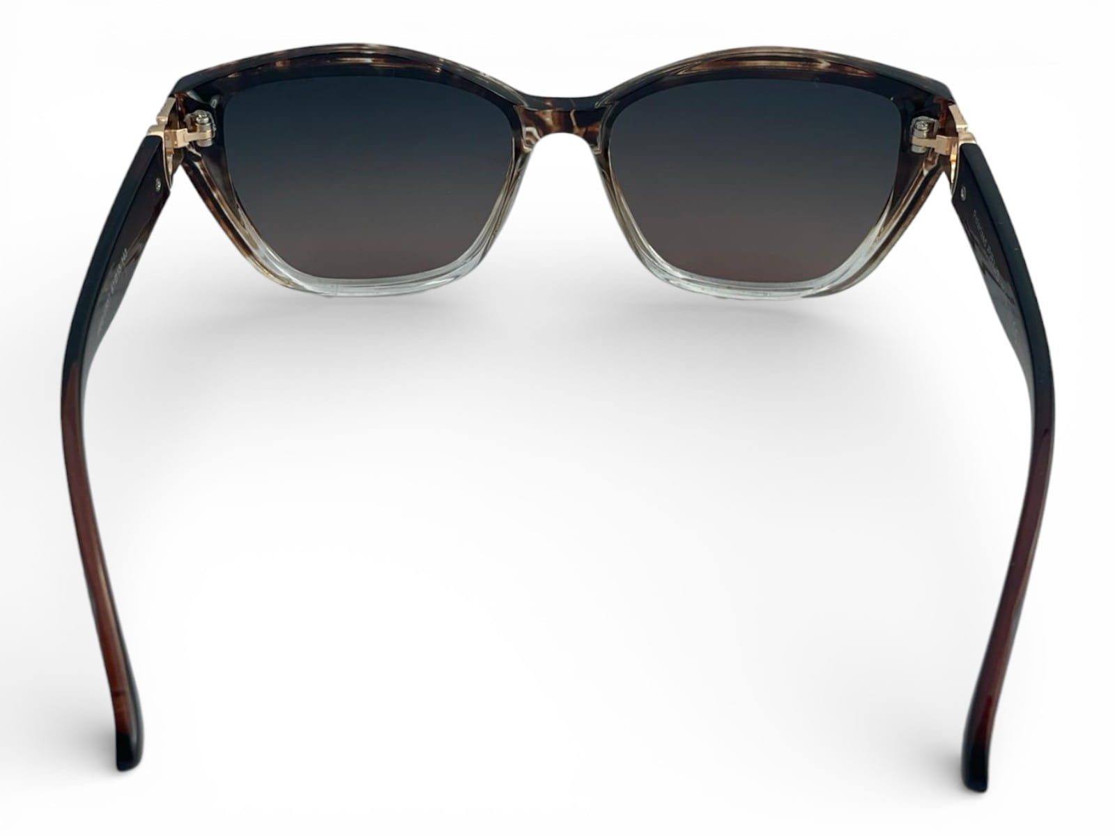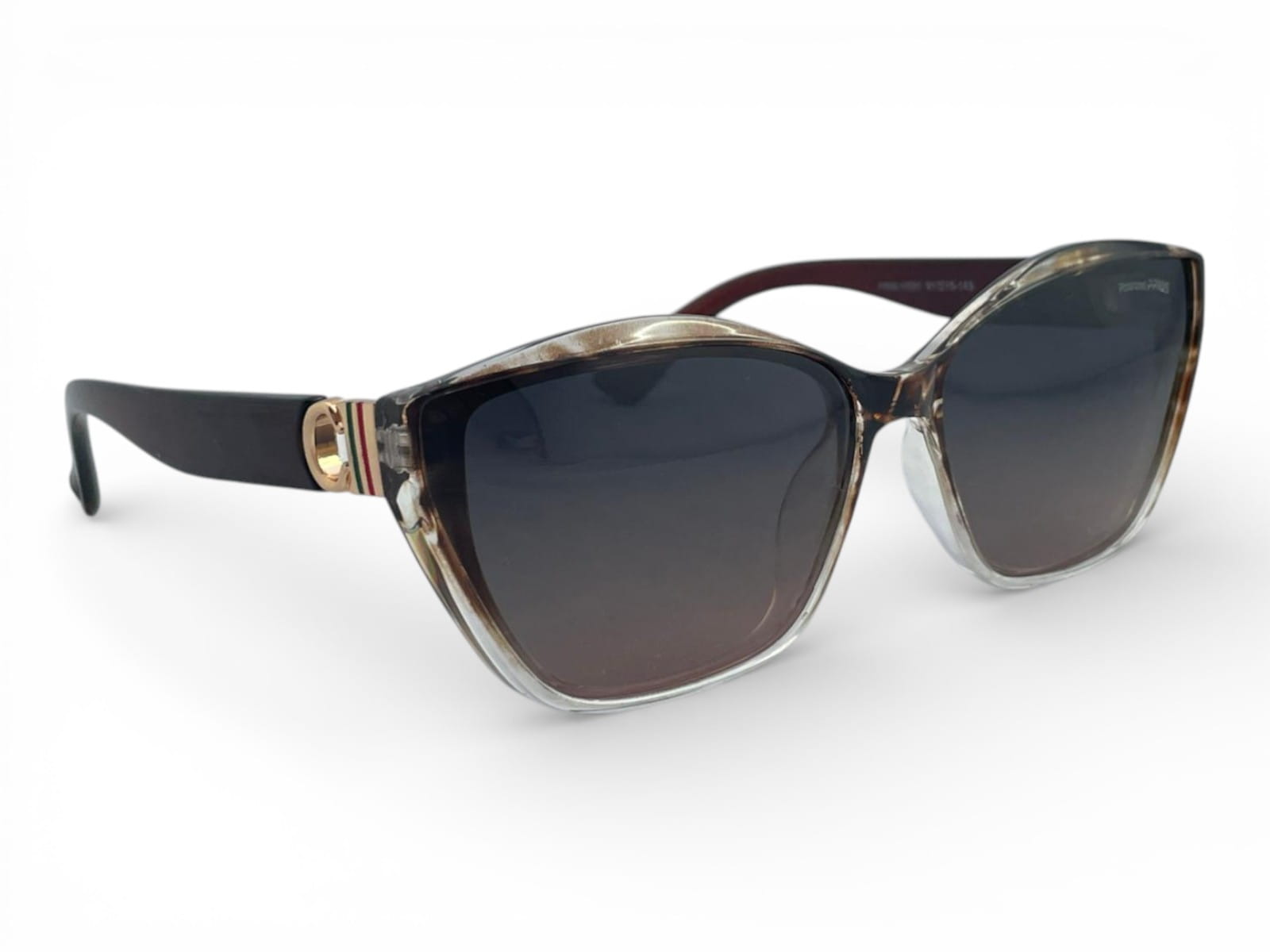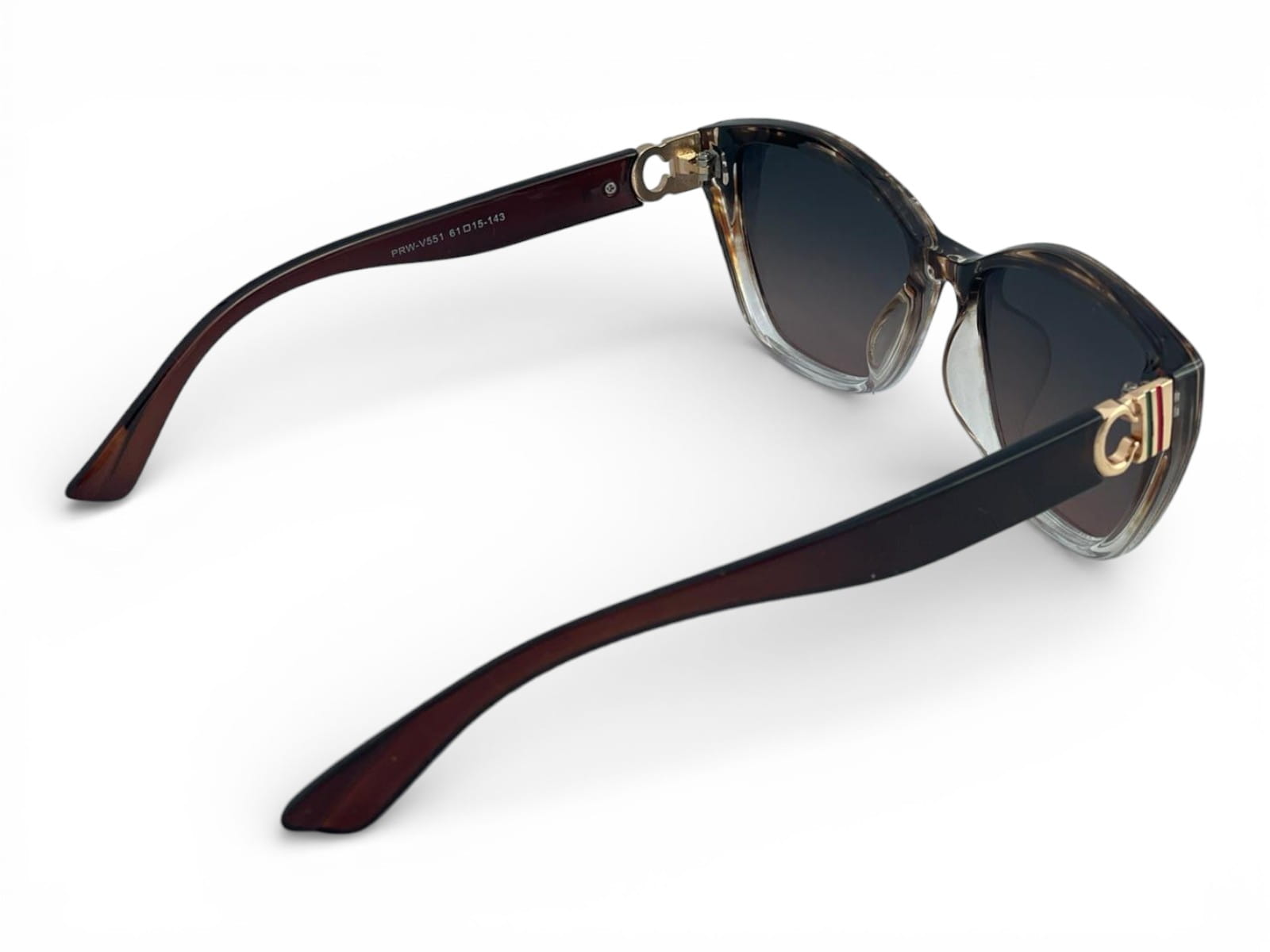 Damskie okulary przeciwsłoneczne PRIUS PRW-551 C4 z oprawką w melanżu odcieni brązu i czarnymi zausznikami. Styl cat eye, soczewki z delikatnym gradientem, polaryzacja i filtr UV400 – funkcjonalność i elegancja w jednym.