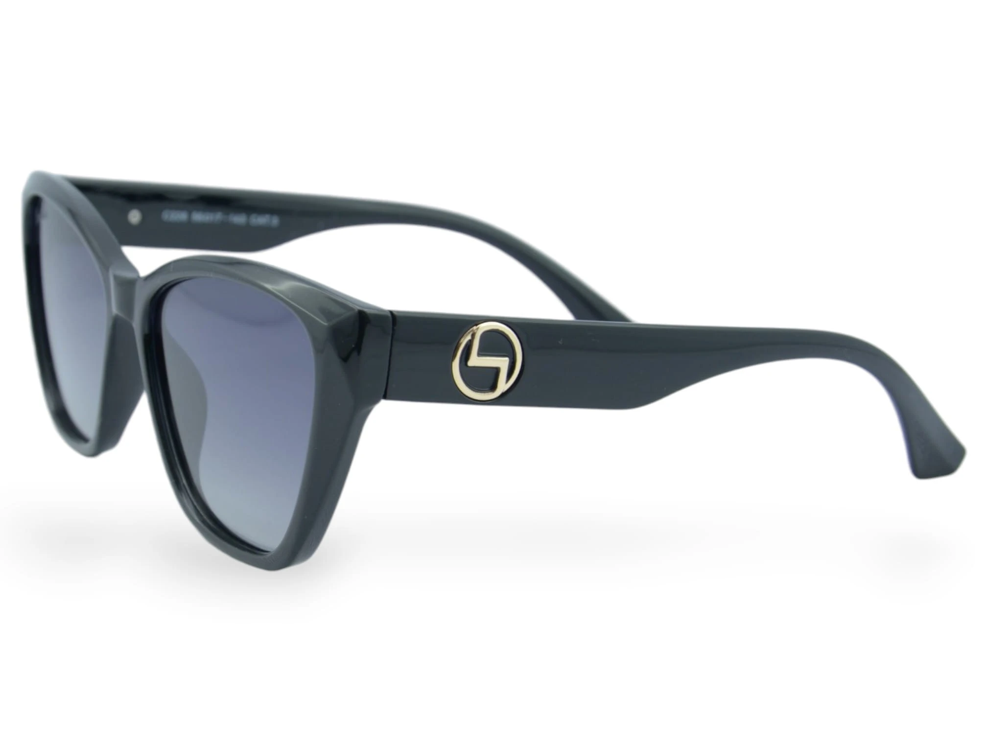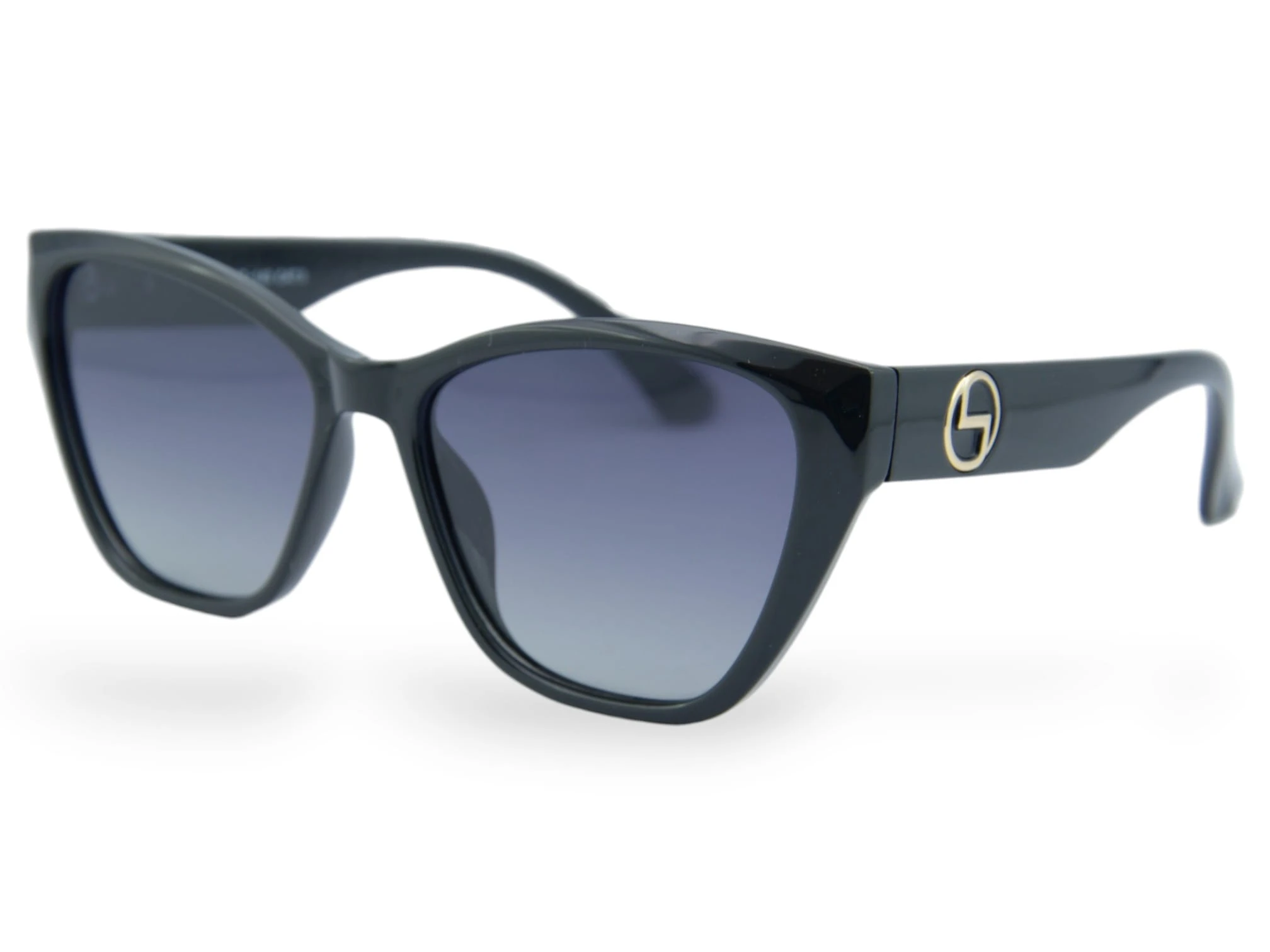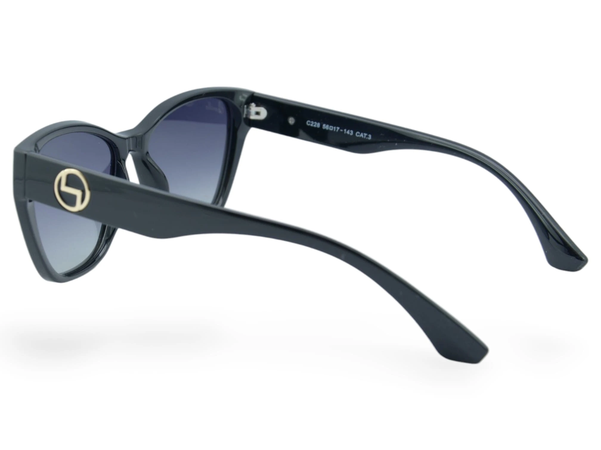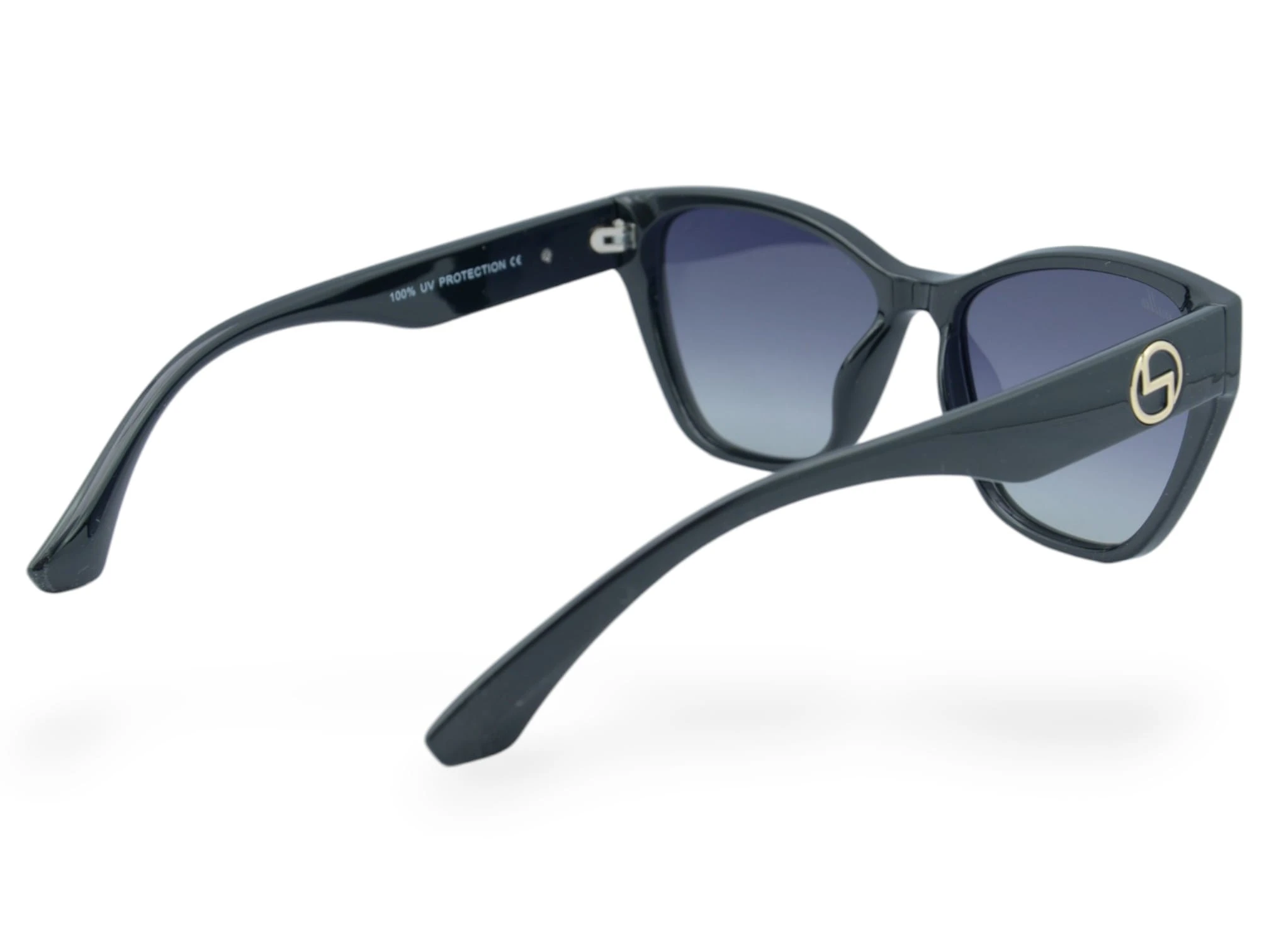 PRIUS Camilla C228 C1 to okulary przeciwsłoneczne damskie o zmysłowym kształcie motyla. Głęboka, czarna błyszcząca oprawa została przełamana biżuteryjnym złotym detalem na zausznikach. Model wyposażono w unikatowe szaro-niebieskie soczewki gradientowe, które zapewniają stylowy wygląd i doskonałą przejrzystość. Dzięki polaryzacji oraz filtrowi UV400, Twoje oczy otrzymują najwyższy poziom ochrony przed odblaskami i szkodliwym promieniowaniem. Idealny wybór dla kobiet, które pragną połączyć modowy look z profesjonalną dbałością o wzrok.