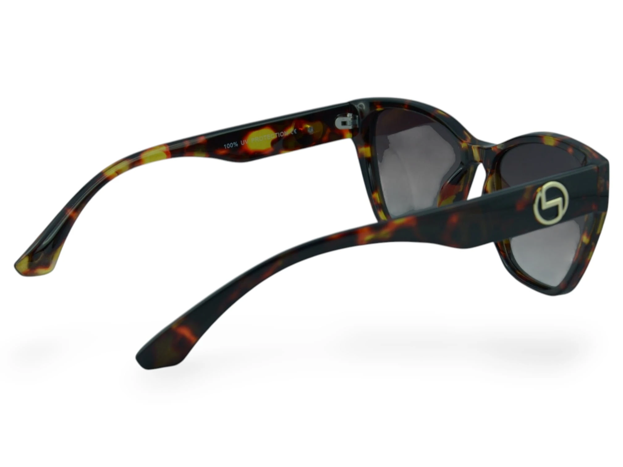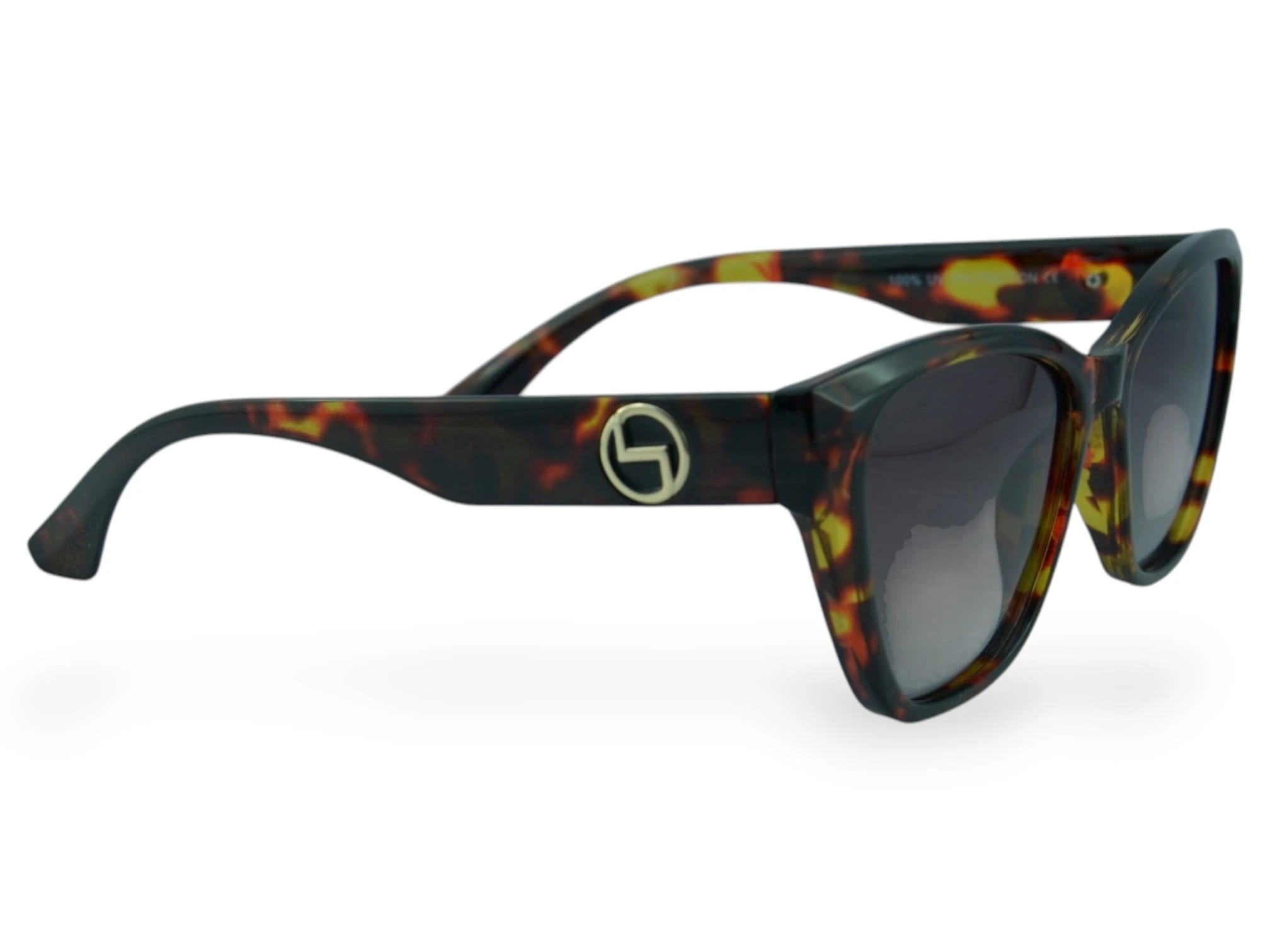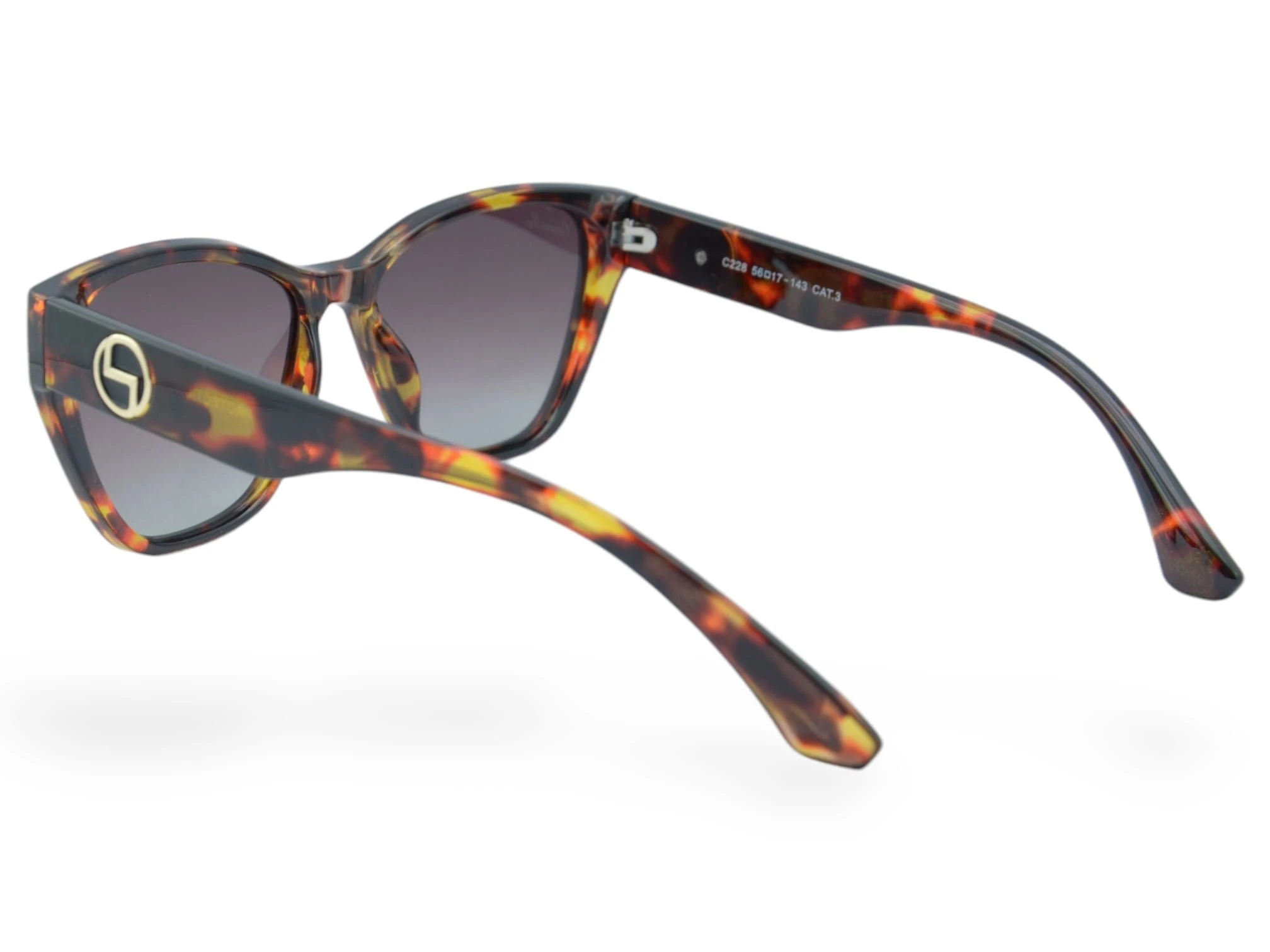 PRIUS Camilla C228 C2 to okulary przeciwsłoneczne damskie o zmysłowym kształcie motyla w ponadczasowym wydaniu szylkretowym. Ciepłe odcienie bursztynu i brązu w oprawie idealnie współgrają z brązowo-szarymi soczewkami gradientowymi, tworząc elegancki i spójny look. Wyposażone w polaryzację oraz filtr UV400, gwarantują pełen relaks dla oczu i najwyższą ochronę przed słońcem. Biżuteryjne złote logo na zausznikach dopełnia całości, czyniąc ten model idealnym dodatkiem do letnich stylizacji.