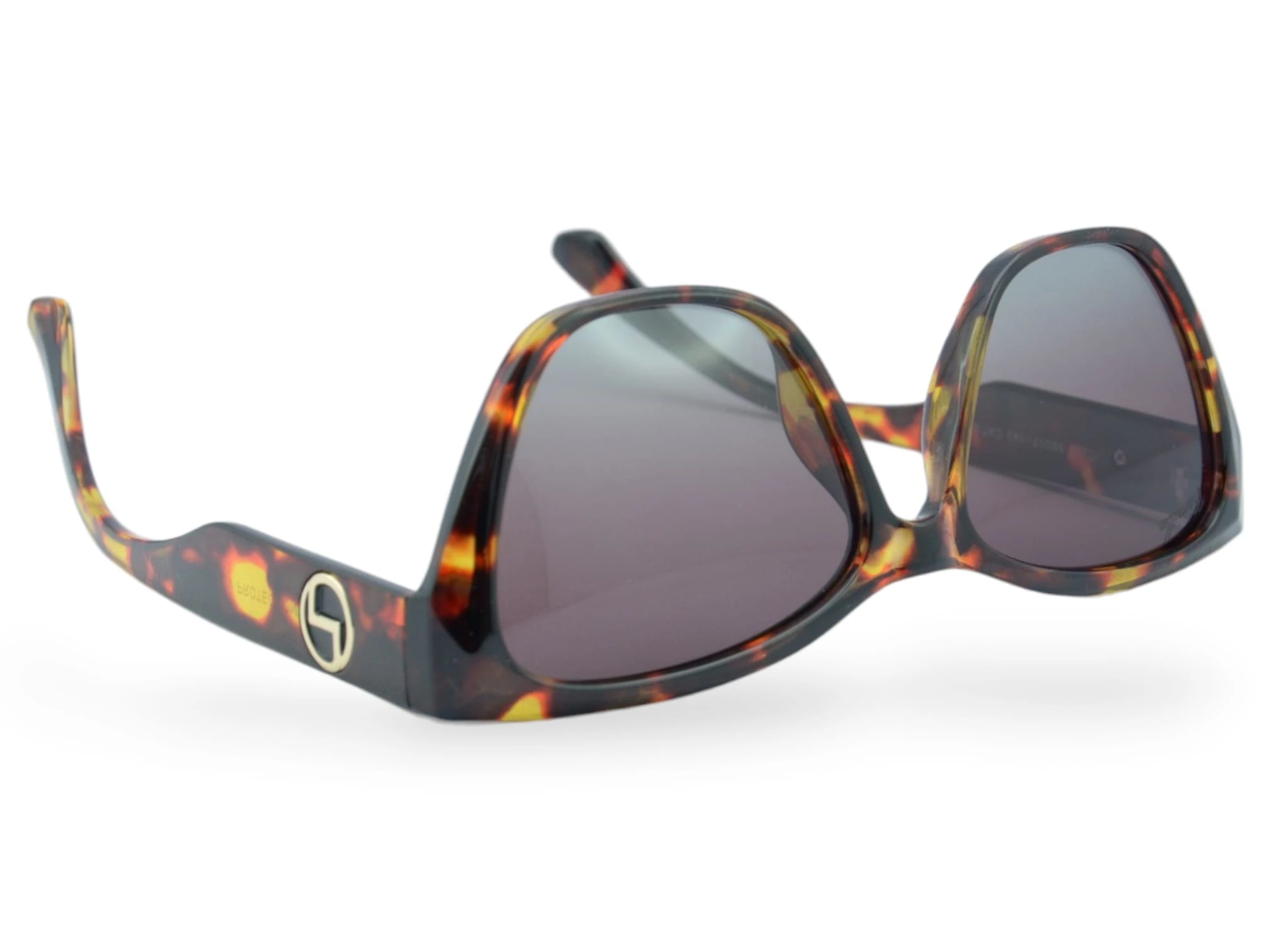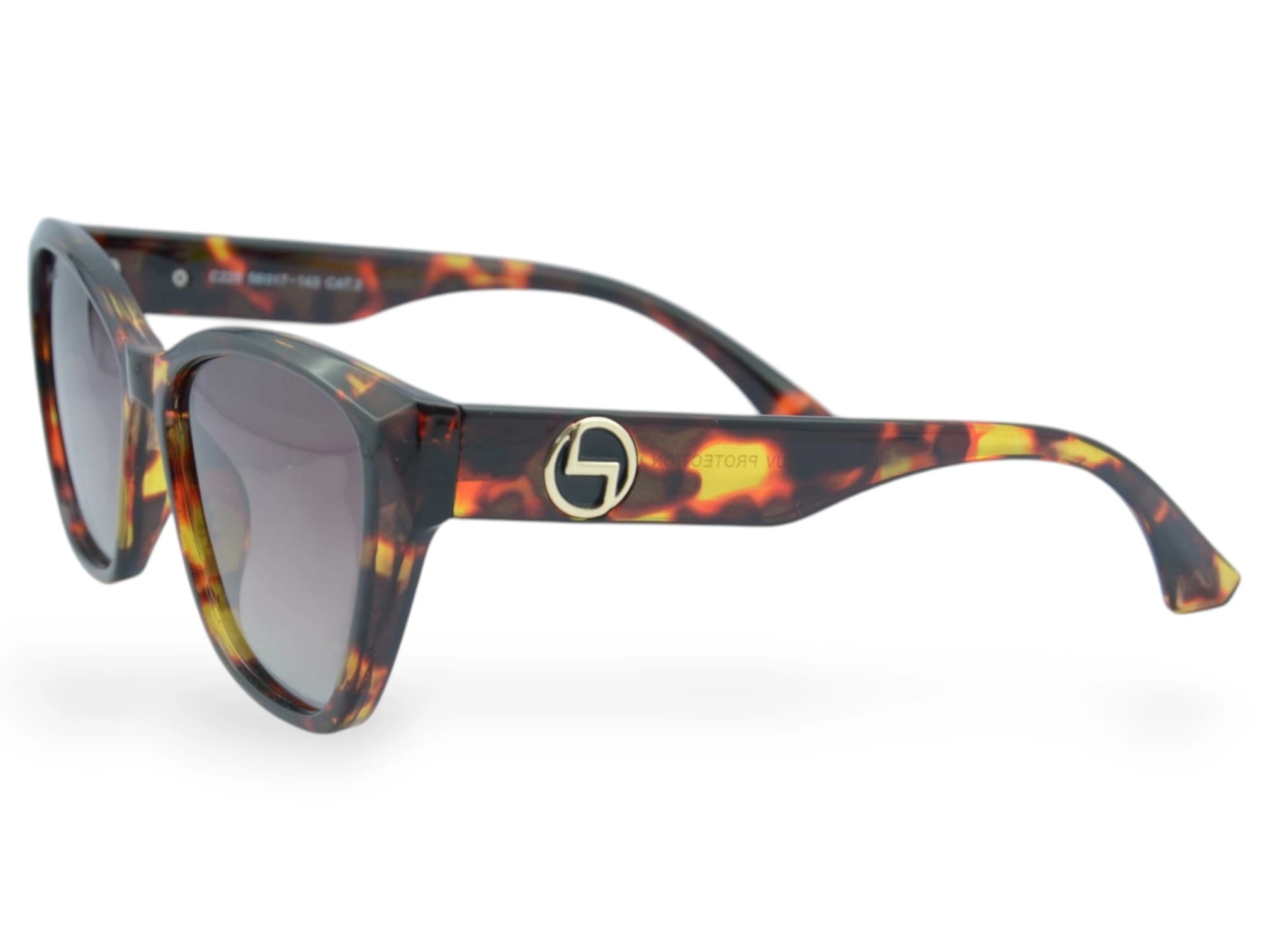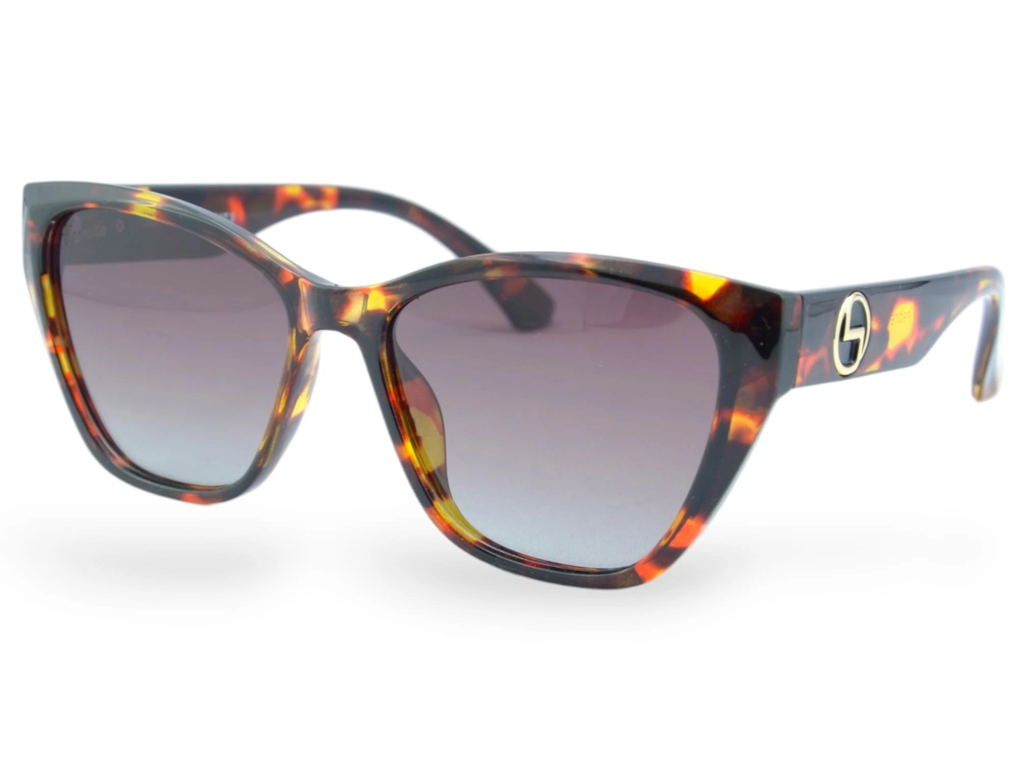PRIUS Camilla C228 C2 to okulary przeciwsłoneczne damskie o zmysłowym kształcie motyla w ponadczasowym wydaniu szylkretowym. Ciepłe odcienie bursztynu i brązu w oprawie idealnie współgrają z brązowo-szarymi soczewkami gradientowymi, tworząc elegancki i spójny look. Wyposażone w polaryzację oraz filtr UV400, gwarantują pełen relaks dla oczu i najwyższą ochronę przed słońcem. Biżuteryjne złote logo na zausznikach dopełnia całości, czyniąc ten model idealnym dodatkiem do letnich stylizacji.