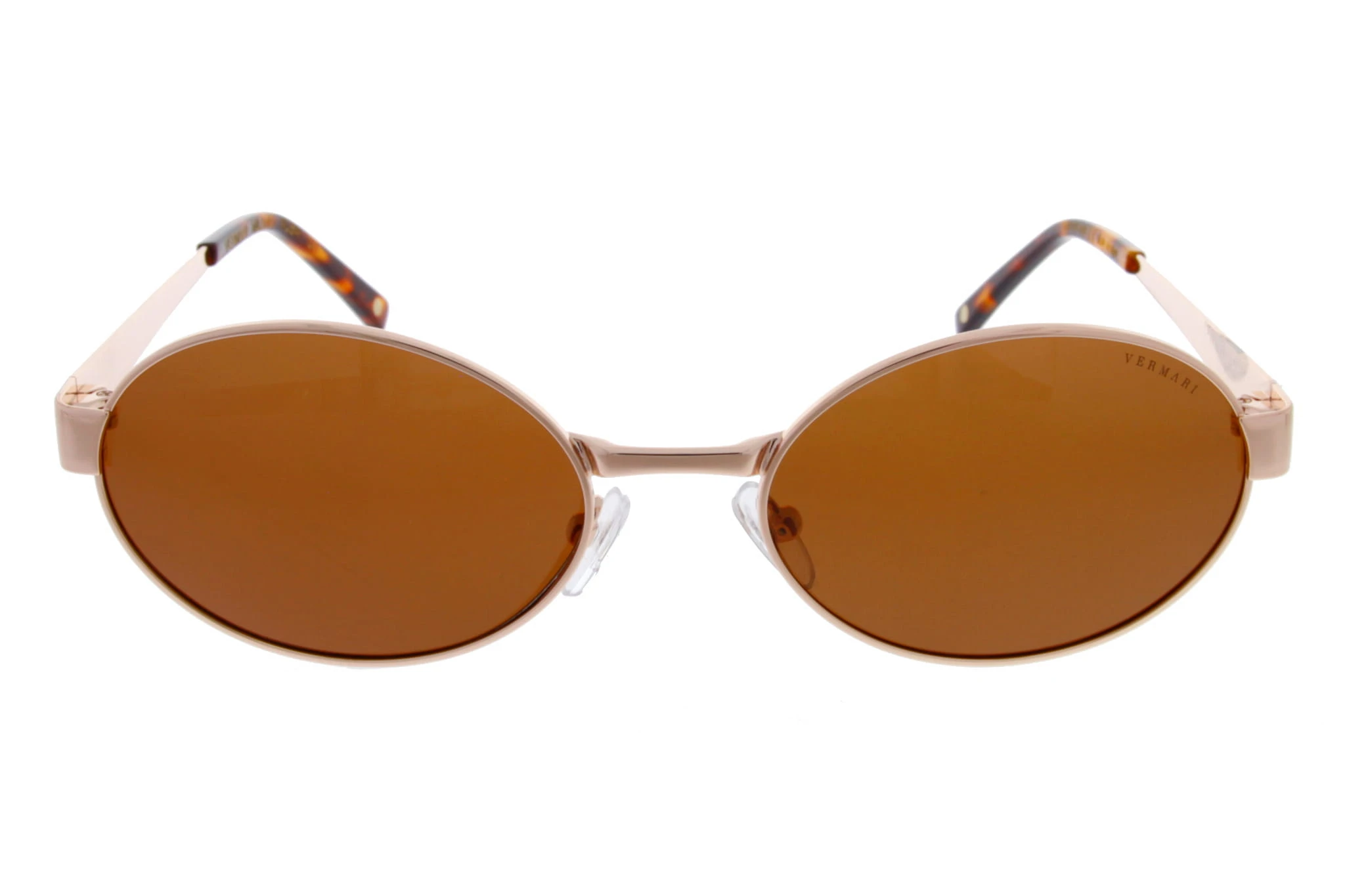 Damskie okulary przeciwsłoneczne Vermari Milano ALBA C3 to elegancki model o delikatnym, owalno-okrągłym fasonie, wykonany z bezniklowego, hipoalergicznego metalu w złotym wykończeniu. Brązowe soczewki z polaryzacją, filtrem UV400 i wewnętrzną powłoką AR zapewniają komfort widzenia, skuteczną ochronę oczu i lekki, kobiecy styl premium.