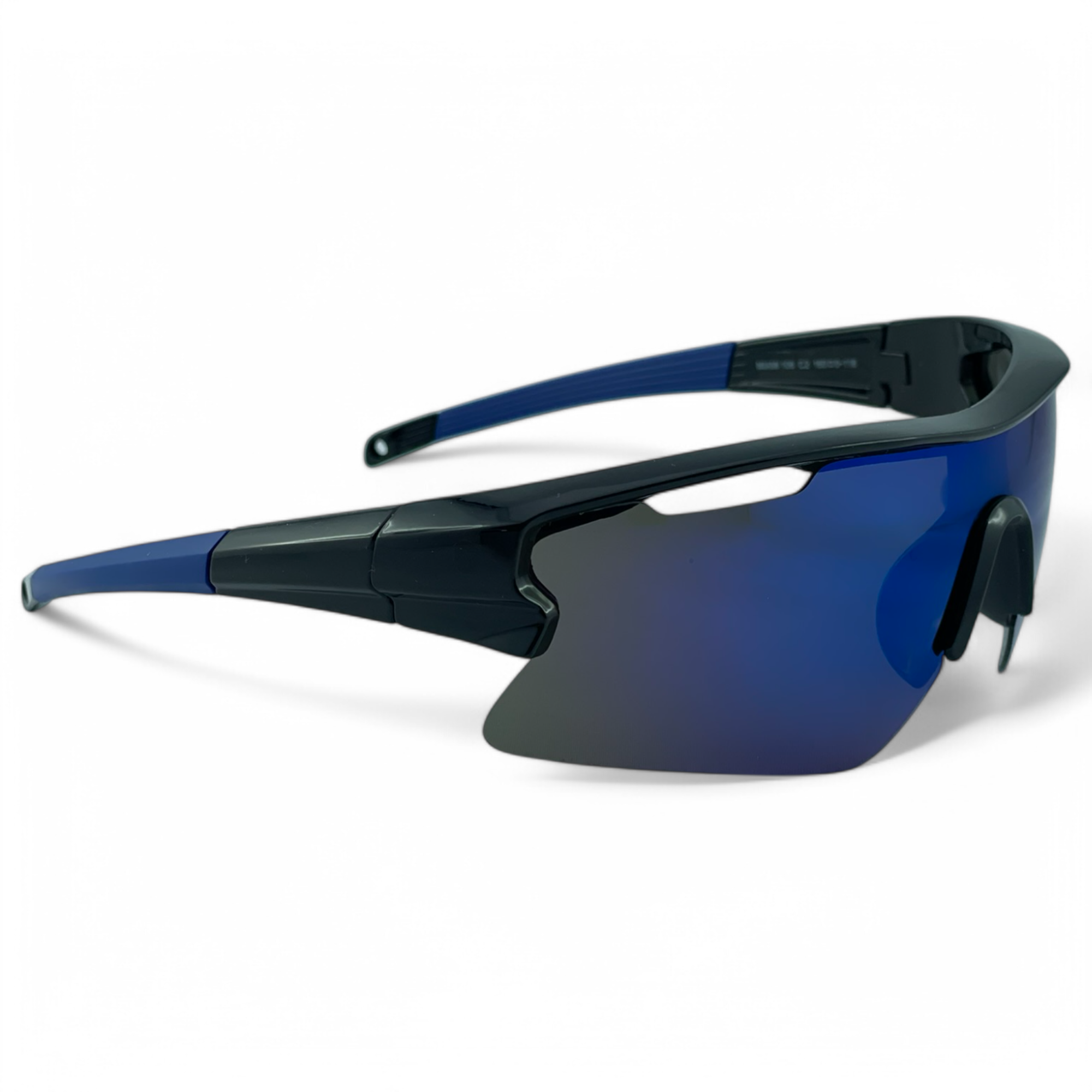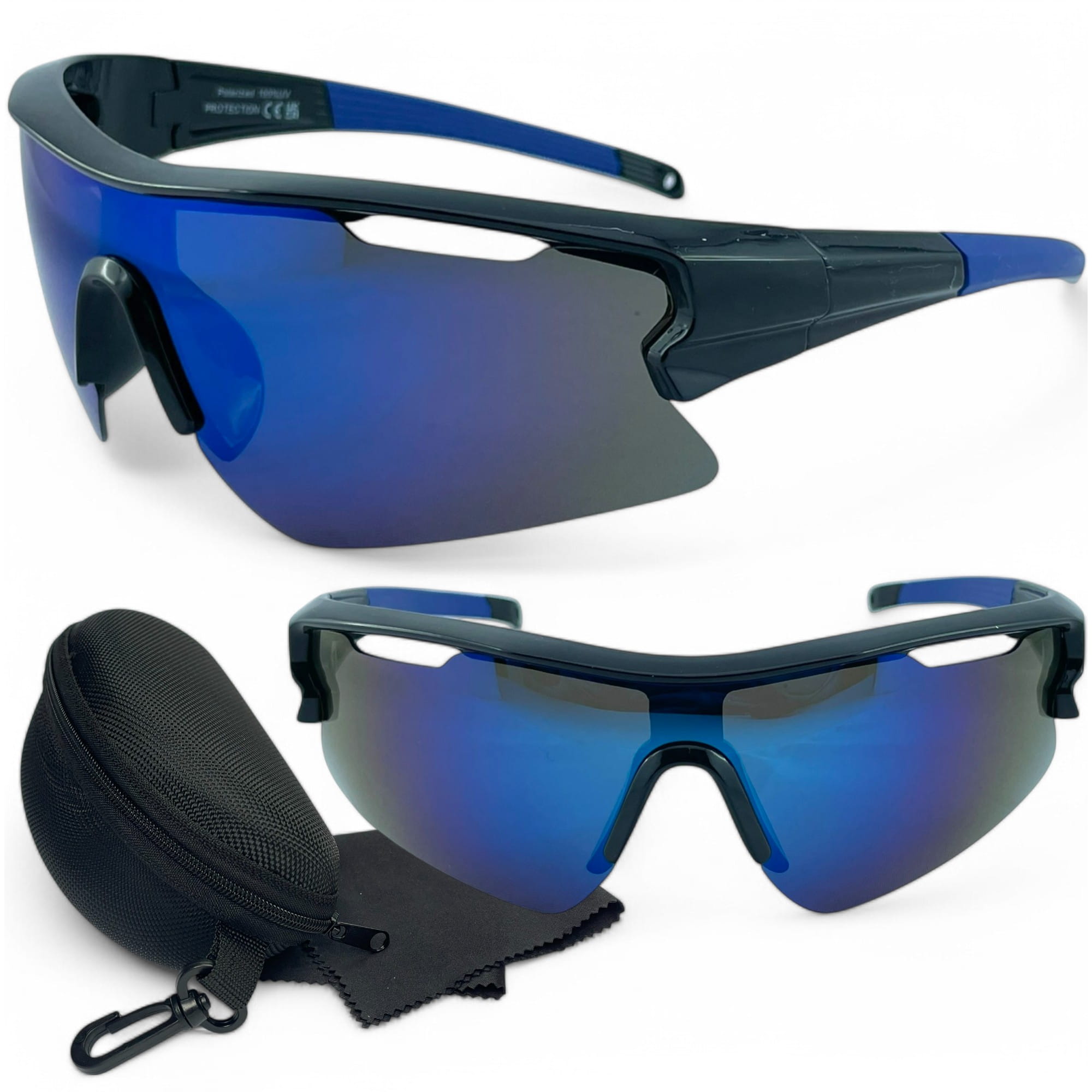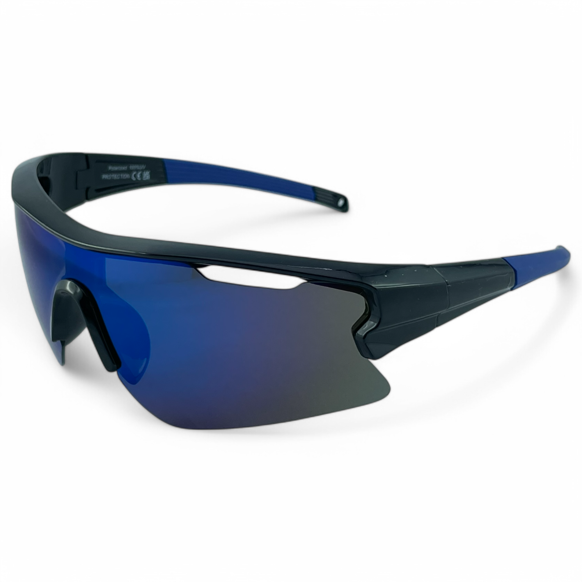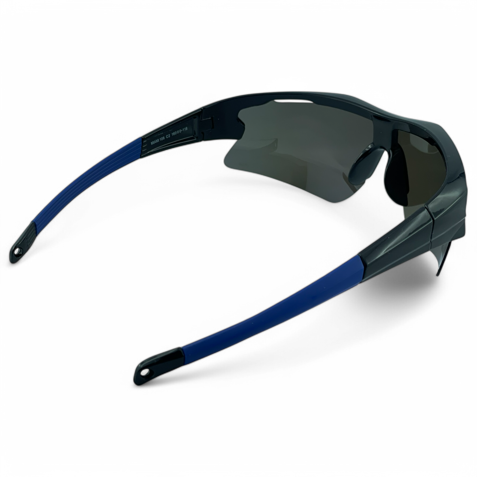 Model PRIUS Miami M106 C2 to nowoczesne okulary sportowe typu maska. Czarna ramka z granatowymi akcentami i lustrzaną niebieską soczewką nadaje całości dynamicznego charakteru. Doskonałe na rower, bieganie i aktywność na pełnym słońcu.