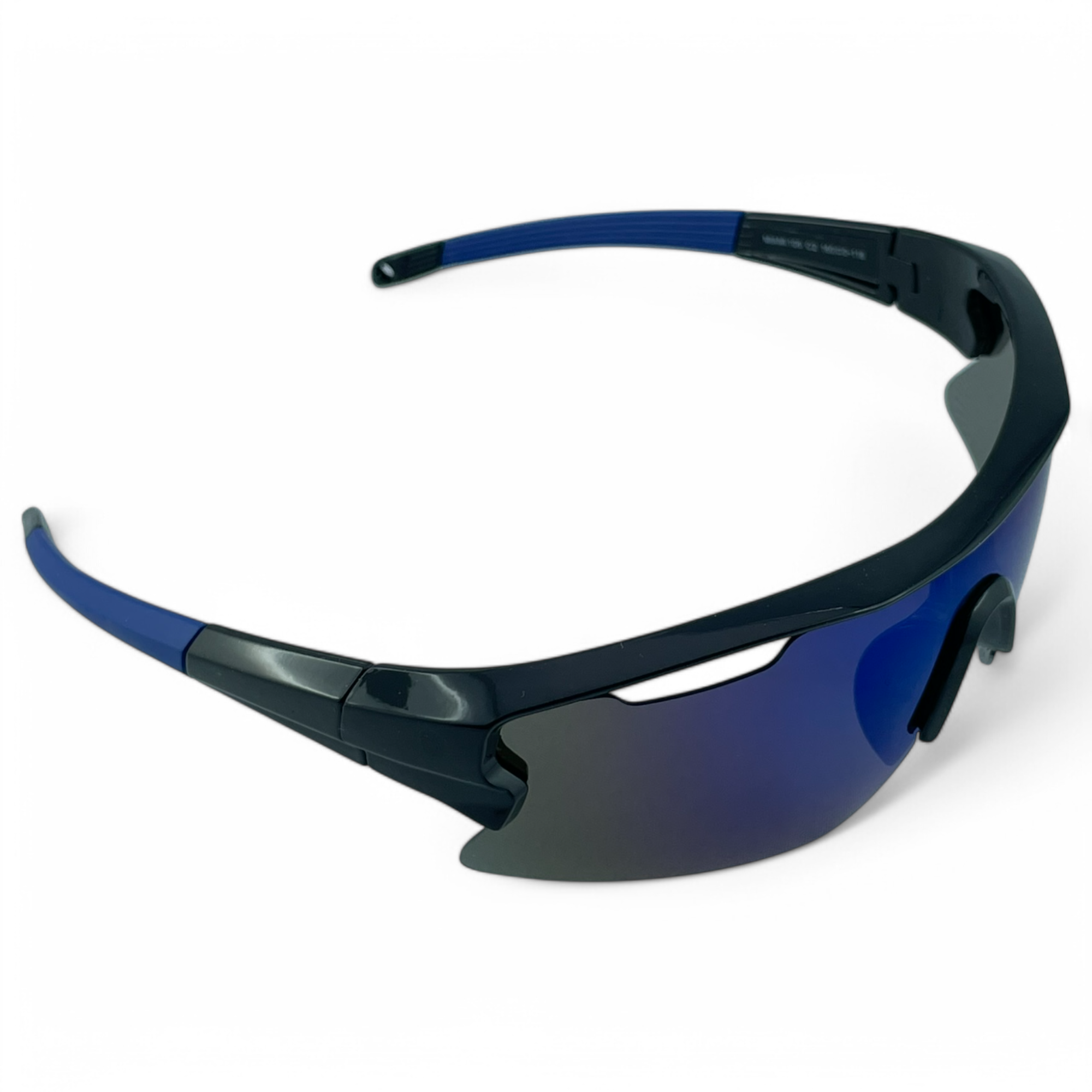 Model M106 C2 to maska sportowa typu wrap stworzona z myślą o dynamicznych aktywnościach. Czarna konstrukcja z granatowymi detalami i lustrzaną niebieską soczewką to połączenie nowoczesnego stylu i zaawansowanej ochrony.